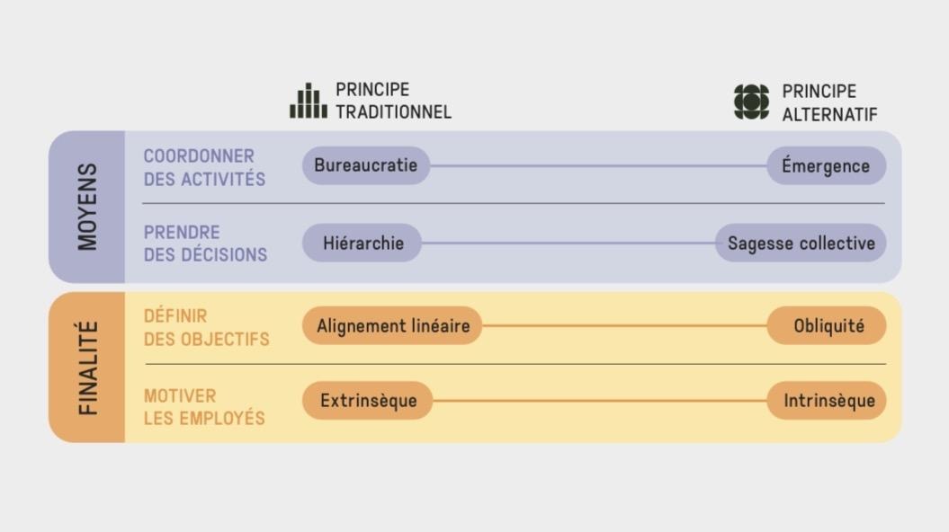Un modèle de management strictement traditionnel est fondé sur une bureaucratie pour coordonner les activités, s’appuie sur une hiérarchie pour la prise de décisions, définit des objectifs selon un alignement linéaire, fondé sur la conviction qu’il suffit d’avoir un but pour pouvoir, d’après lui, remonter automatiquement la chaîne des actions à promouvoir, comme on le fait dans les calendriers rétrospectifs. On compte sur les récompenses extrinsèques - salaire, titre, vacances, avantages sociaux - pour motiver les employés. Vous reconnaissez peut-être là les charmes des places de travail que vous avez occupées. Dans un modèle alternatif, en revanche, on coordonne les activités selon le principe d’émergence, en laissant une marge de manœuvre à une coordination spontanée (mais concertée) des activités au travers des actions et des comportements assumés par les différents acteurs. Pour la prise de décision, l’approche alternative compte sur la sagesse du collectif active au travers de processus plus horizontaux (concertation, vote, etc.) suivant le présupposé qu’on prend de meilleures décisions lorsque l’on s’appuie sur un large groupe de personnes concernées. Les objectifs sont définis de manière oblique parce que l’expérimentation et le tâtonnement offrent souvent d’excellents résultats. C’est un peu l’effet « tarte Tatin » si vous permettez la comparaison : Google qui laisse la place à l’expérimentation pour ses employés, ou Alibaba qui débouche sur un modèle d’affaire percutant alors qu’il cherchait d’abord à simplement à simplifier les transactions, en sont deux exemples emblématiques. La motivation des collaborateurs gagne à être intrinsèque : on fait son job parce qu’on l’aime, qu’on y trouve du sens et qu’on s’y sent utile.